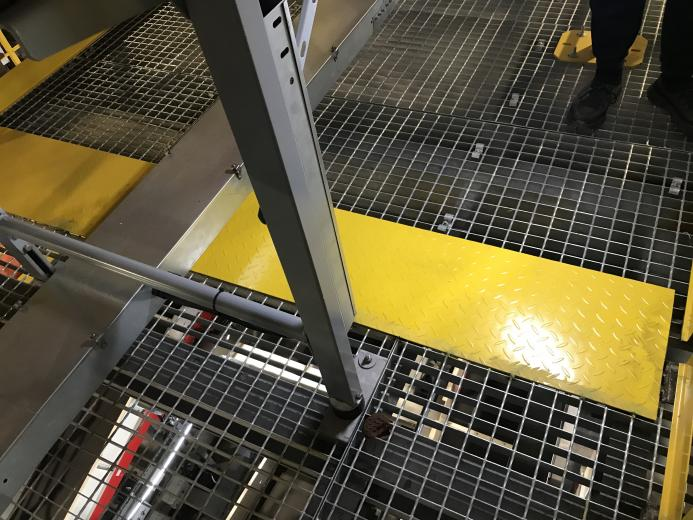 而在建筑伸缩缝位置,钢平台完全断开,并预留出50mm的变形裕量。在冬季气温下降时,伸缩缝位置最大缝隙会超过100mm,存在人员踩空绊倒风险。设计人员借鉴建筑伸缩缝设计理念,在钢平台伸缩缝位置加装防护盖板,避免踩空,并将颜色设计为醒目的警戒黄,提醒过往维护和巡检人员注意安全。