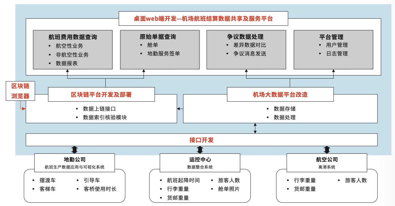 航司和机场之间的财务结算往往都是通过人工核查,纸质单据,微信沟通来进行校对,双方数据没打通,效率低,且容易出错,其次,对于例行服务和非例行服务的数据和签单,机场 、航司之间缺乏信任机制。本系统旨在以区块链技术建立起航司和机场之间的数据信任机制。实现数据的不可篡改,来源一致,并提供在线的协商机制,来解决效率和信任问题。已应用于广州白云国际机场(区块链技术在民航机场的首次应用落地)。