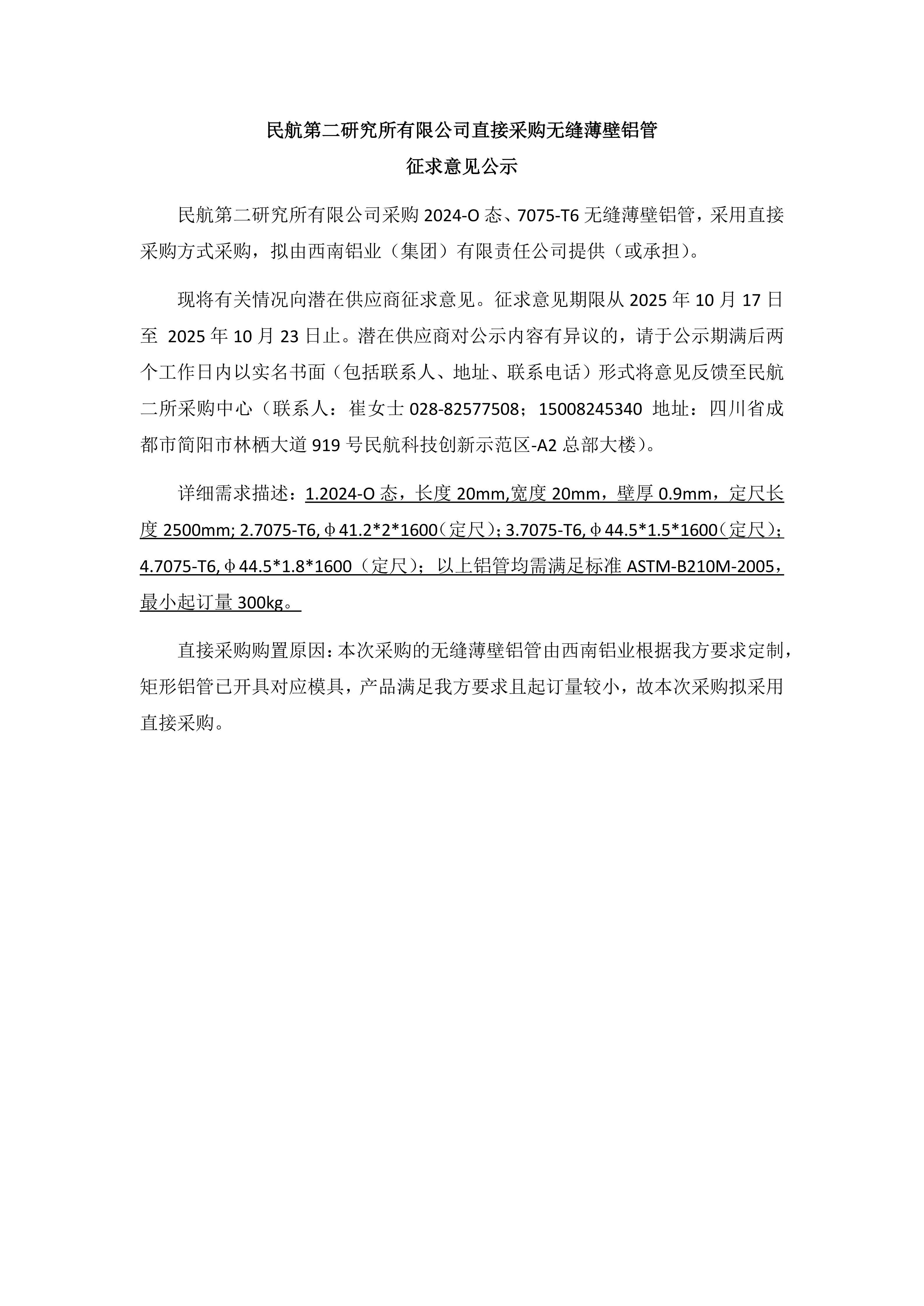 民航第二研究所有限公司直接采购无缝薄壁铝管征求意见公示
