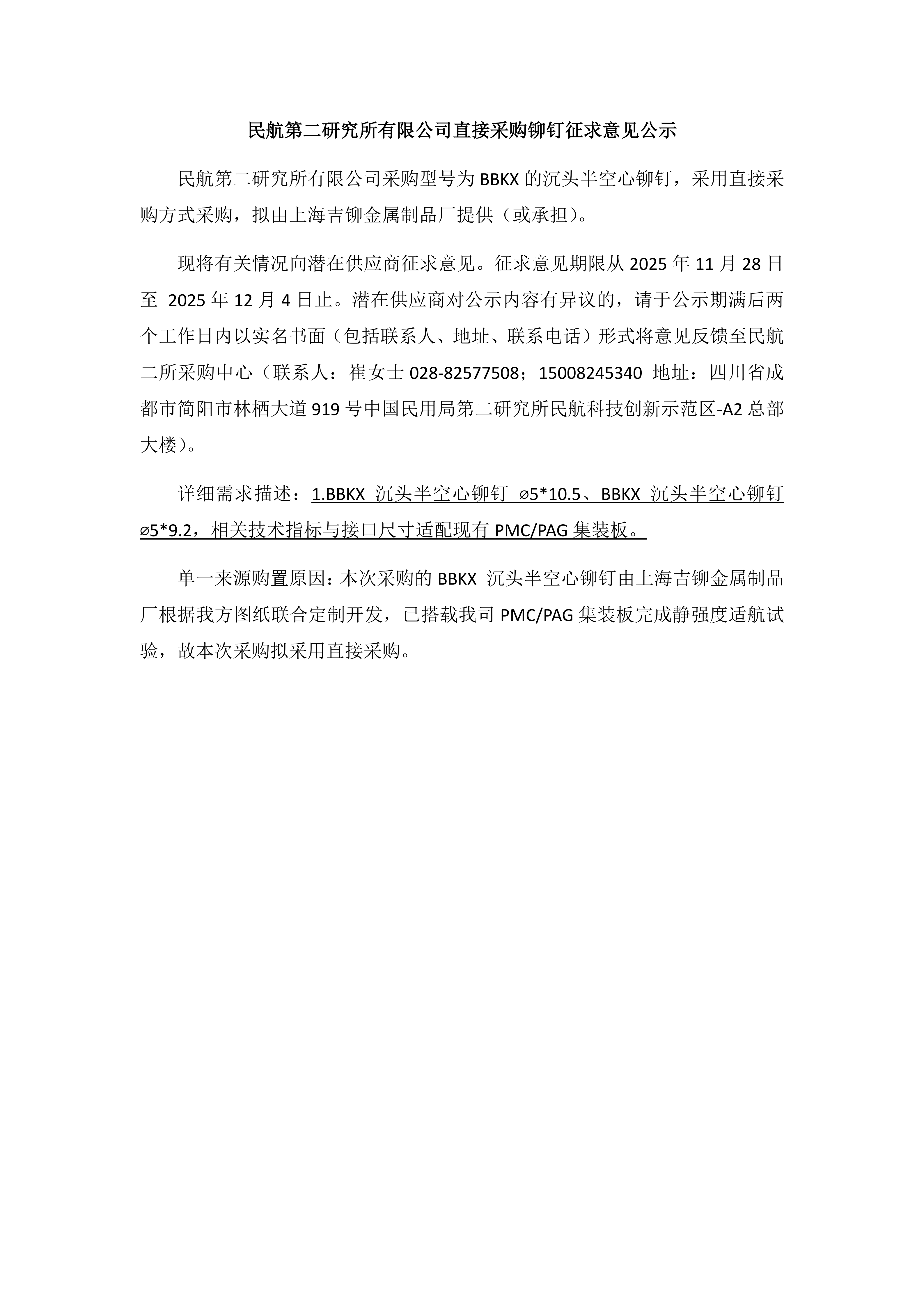 民航第二研究所有限公司直接采购铆钉征求意见公示