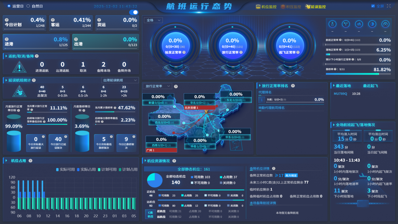 在信息互联方面,打破核心生产系统之间信息孤岛,构建“机场综合运行一张图”机场运行态势图,可实现机场指挥中心实时知晓航班是否延误、放行不正常以及临界航班,极大提升未来安全运营效能;此外实现空管系统与机场指挥中心之间航行轨迹、电子进程单、机位运行数据、计划推出时间、气象等数据互通,从而提升空管与机场之间的协同效率。