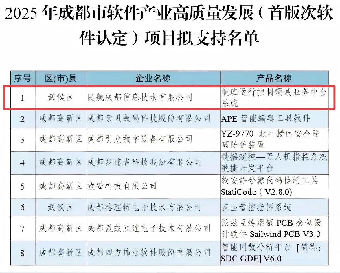 近日,成都市经济和信息化局正式公布2025年度成都市“首版次软件产品”认定和支持名单。民航二所电子公司旗下信息公司自主研发的“航班运行控制领域业务中台系统”,凭借其卓越的技术创新性和广阔的应用前景,荣列榜单。