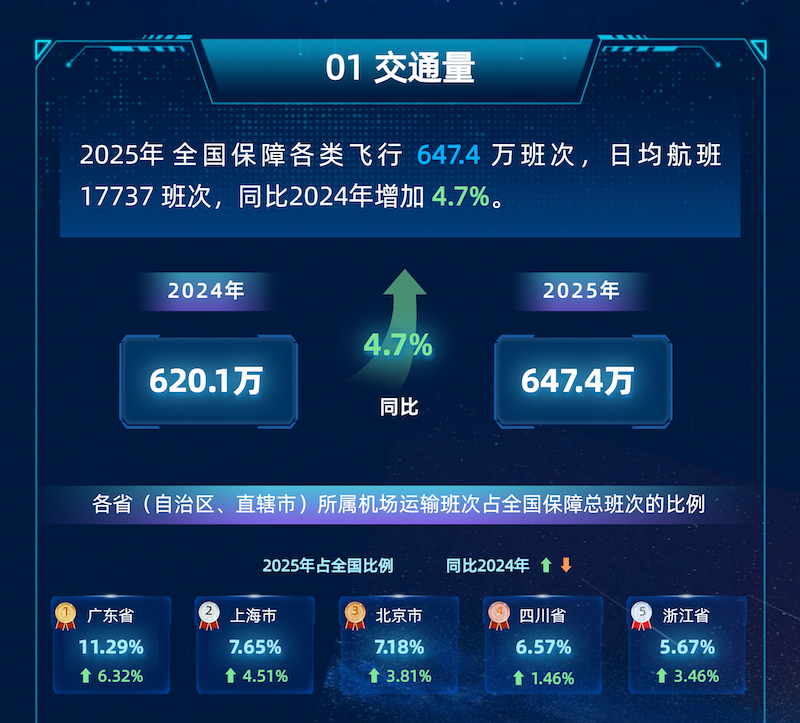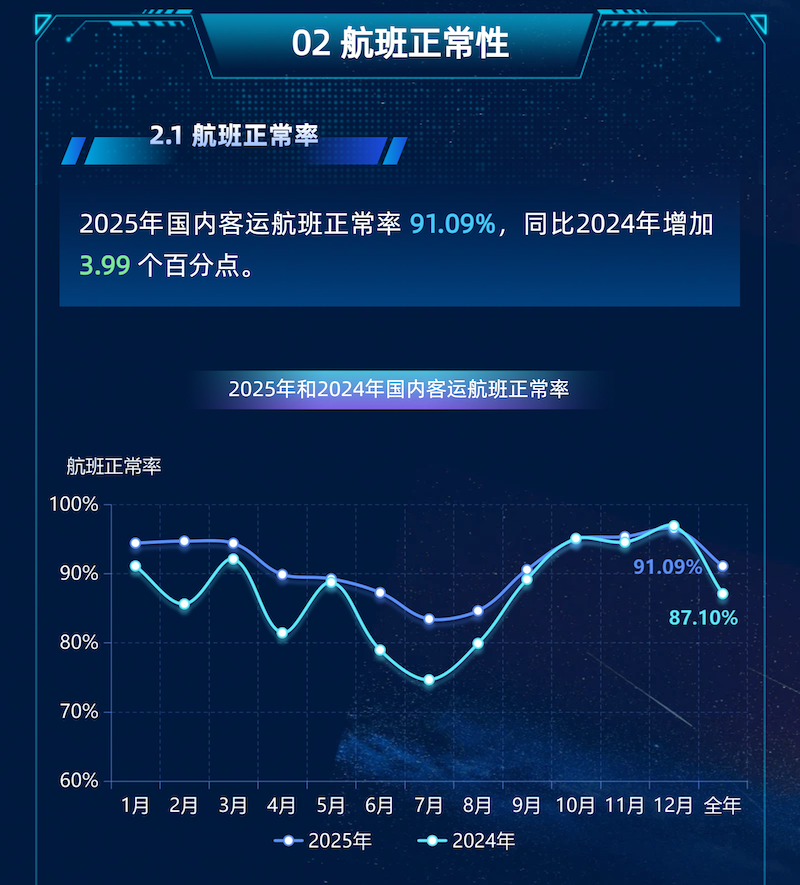 数据显示,2025年全国累计保障飞行647.4万班次,同比增长4.7%;国内客运航班正常率达91.09%,较2024年提升3.99个百分点,运行品质稳步提升。