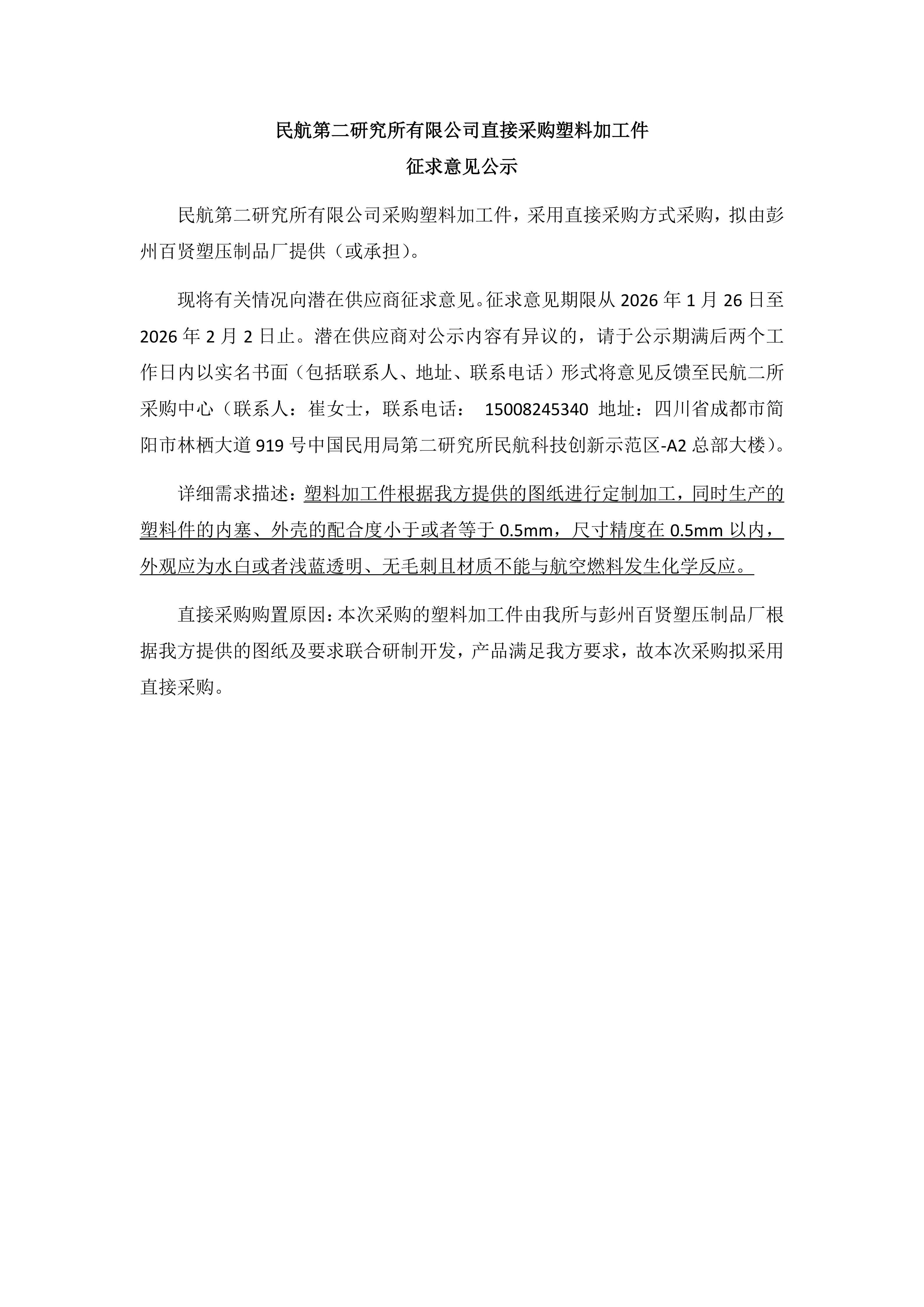 民航第二研究所有限公司直接采购塑料加工件征求意见公示