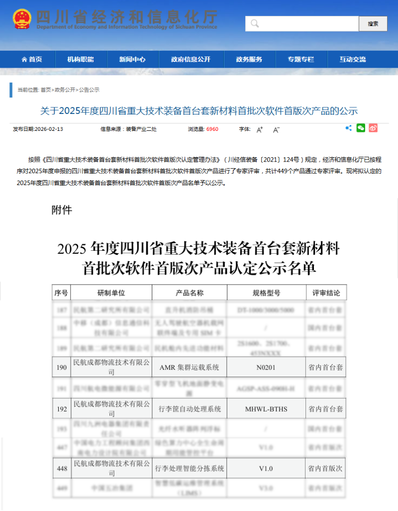 近日,四川省经济和信息化厅正式发布《2025年度四川省重大技术装备首台套新材料首批次软件首版次产品认定公示名单》,民航二所电子公司旗下物流公司凭借在智慧物流领域的深厚技术积淀与自主创新能力,旗下AMR 集群运载系统、行李筐自动处理系统两项装备获评 “省内首台套”,行李处理智能分拣系统获评 “省内首版次”。此次“软硬结合”三项产品同时获省级权威认定,标志着公司在航空物流关键核心技术攻关上取得重大突破,更彰显了公司在推动国产高端物流装备自主可控方面的硬核实力。