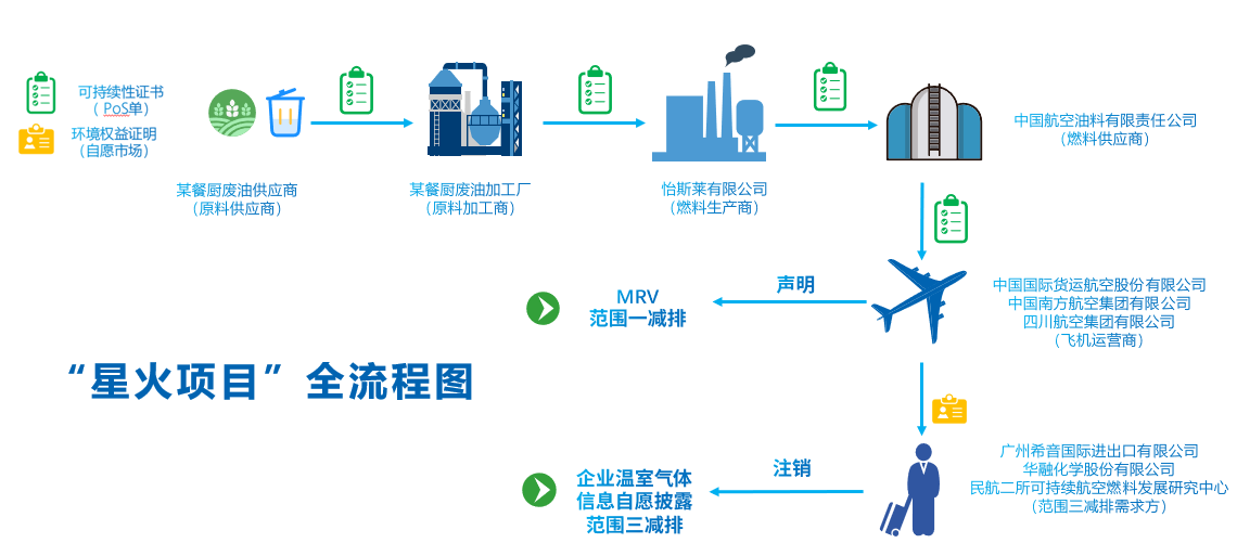 星火项目”实际上是SAF全场景应用模式的一个生动实践。依托真实航空运输场景(客运和货运),“星火项目”完成了SAF从原料收集、生产、储运、加注,到燃烧使用、减排量核算、环境权益传递与声明的全链条实践验证。从餐厨厂的废弃食用油脂(UCO,俗称地沟油)原料回收,到怡斯莱张家港SAF工厂的燃料生产,到中国航油西南公司在成都双流机场的SAF掺混和加注,再到航司的SAF飞行应用,全过程依托自主航空燃料可持续性认证体系。民航二所对SAF碳排放进行了精准核算(每吨SAF实现了3.3吨的CO2减碳效果),并构建了全流程溯源管理。民航二所和中国航油联合打造的SAF范围三环境权益登记注销平台(AnchorTrace)对环境权益交易和转移进行了登记、声明和核销。华融化学、希音公司和民航二所SAF中心承担了本次项目大部分SAF溢价,抵消了企业员工差旅、货物运输的相关碳排放,履行了企业ESG社会责任,助力民航业低碳发展。