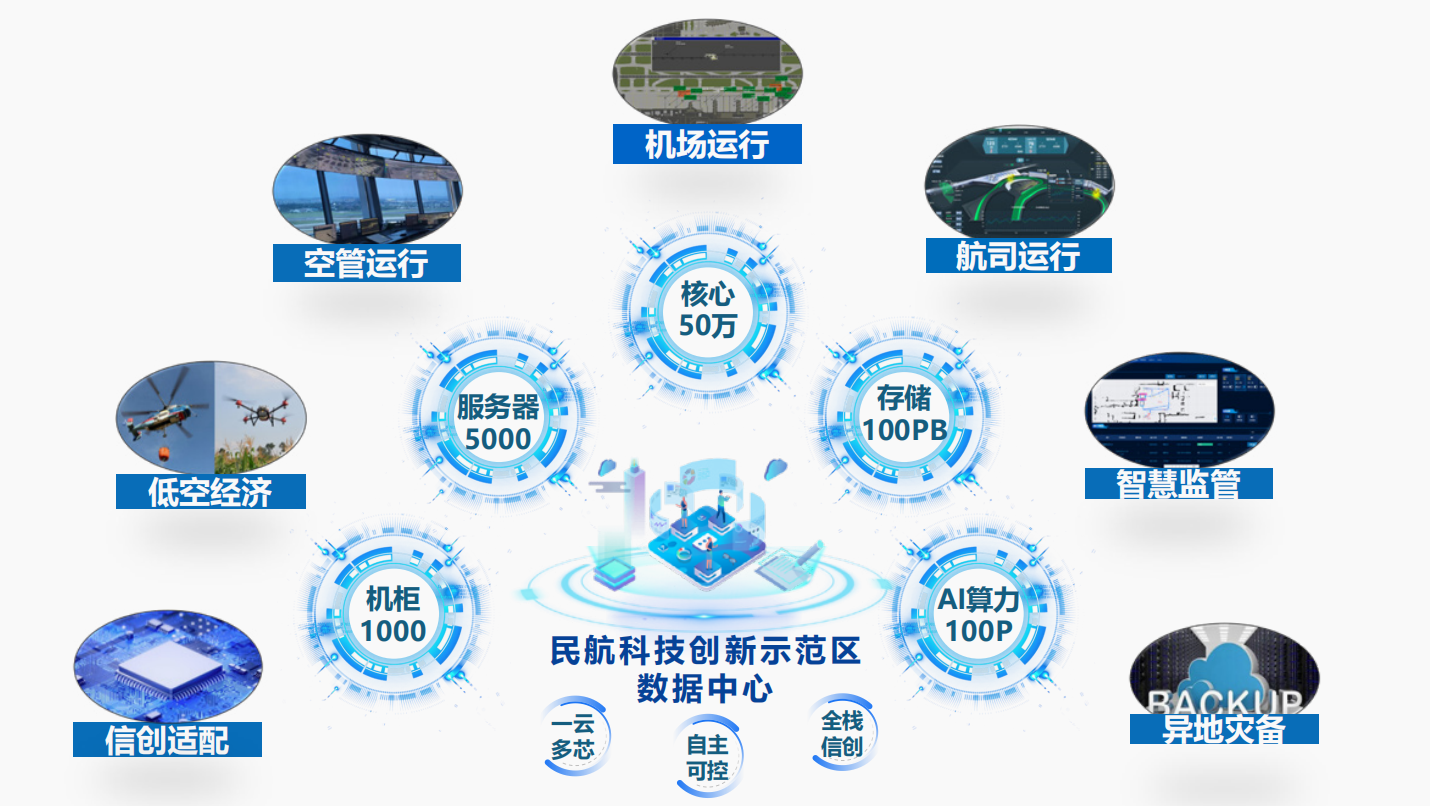 民航首朵自主创新云与全栈国产生态数据中心:民航科技创新示范区数据中心是一座通过了国标GB50174认证的A级数据中心,具备全栈国产、绿色低碳、一云多芯、多元算力、先进智能算力、协同创新等先进特征。示范区数据中心荣获“2023年数据中心实施样板项目”、“2024年深度用云先锋”案例称号和“行业云平台一云多芯领航者”典型案例称号,系交通运输行业用云上云推进中心的成员单位。数据中心可为民航提供50万核通用算力和100PFLOPS智能算力,可支持大规模并行计算、大数据分析及AI训练等任务,能支撑百亿参数大模型训练、推理需求,满足民航复杂业务场景下的高性能需求。民航科技云采用全国产化的云平台底座,统一纳管了鲲鹏、海光等类型服务器,支持统信、麒麟、欧拉等操作系统。可对外提供计算、存储、网络、安全、数据库和中间件等一站式云服务,具有完全自主可控、多厂融合、功能开放、自助服务、安全稳定等技术特性。